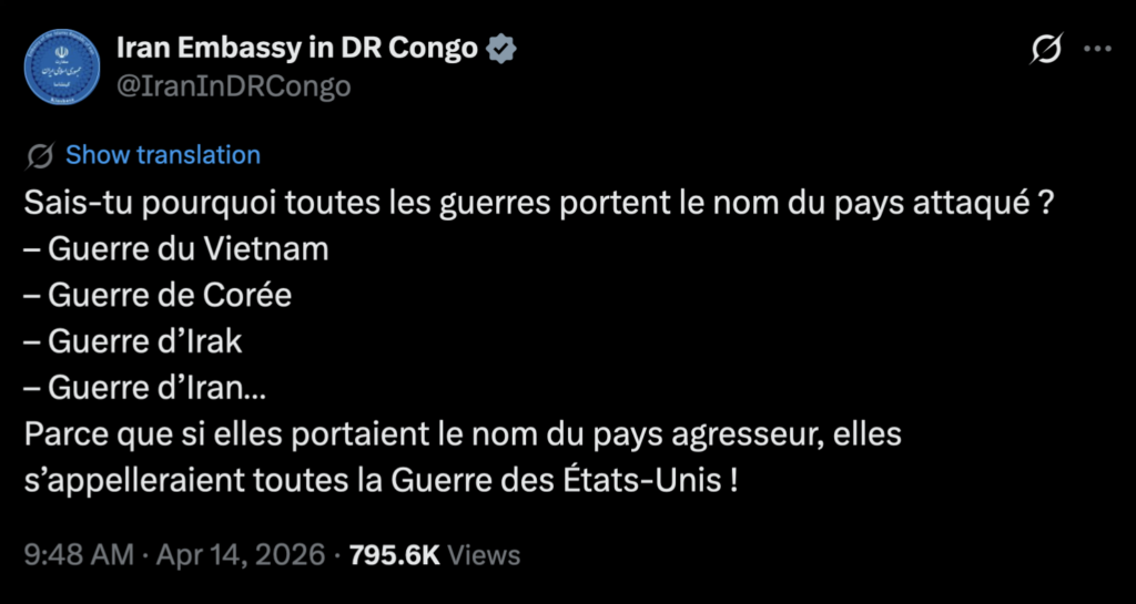 Réseau social X, @IranInDRCongo : https://x.com/IranInDRCongo/status/2043959444149559642?s=20