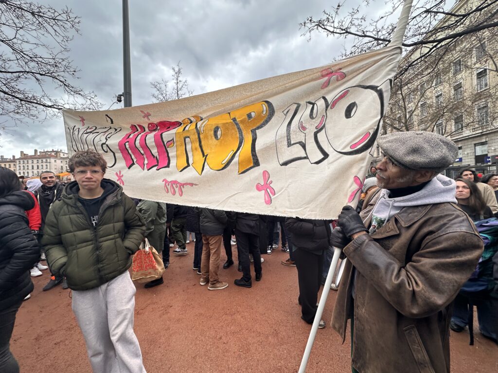 Dans ce contexte de mobilisation politique et sociale, certains collectifs ont choisi d’inscrire leur engagement dans une dimension culturelle. C’est notamment le cas du collectif Unité Hip Hop Lyon, qui a organisé au sein même de la manifestation un moment dédié à l’expression artistique issue de la culture hip-hop.